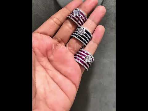 This gorgeous ring is perfect for many occasions. We have made it in both ruby and sapphire colorways for you to choose from. The center features a brilliant round cut white stone. The ring arm is set with a combination of square cut ruby sapphires and round cut white stones. The wider ring arm is comfortable to wear. Total weight is approximately 8 carats. The ring is made of 925 silver throughout, with thick gold plating, which makes the luster last longer compared to other single layer plating. The style is personalized and gorgeous, bringing more possibilities for your fashion collocation.