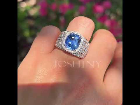 This exquisite sapphire ring is a stunner! The design is classically gorgeous and the craftsmanship is exquisitely detailed and sparkling! It can be worn by both men and women. The center features a stunning cushion cut sapphire. The ring arm is pave set with brilliant round cut white stones. Perfect for many occasions. Total weight is approximately 9 carats. The ring is made of 925 silver throughout, with thick gold plating, which makes the luster last longer compared to other single layer plating. The style is classic and gorgeous, bringing more possibilities for your fashion collocation.