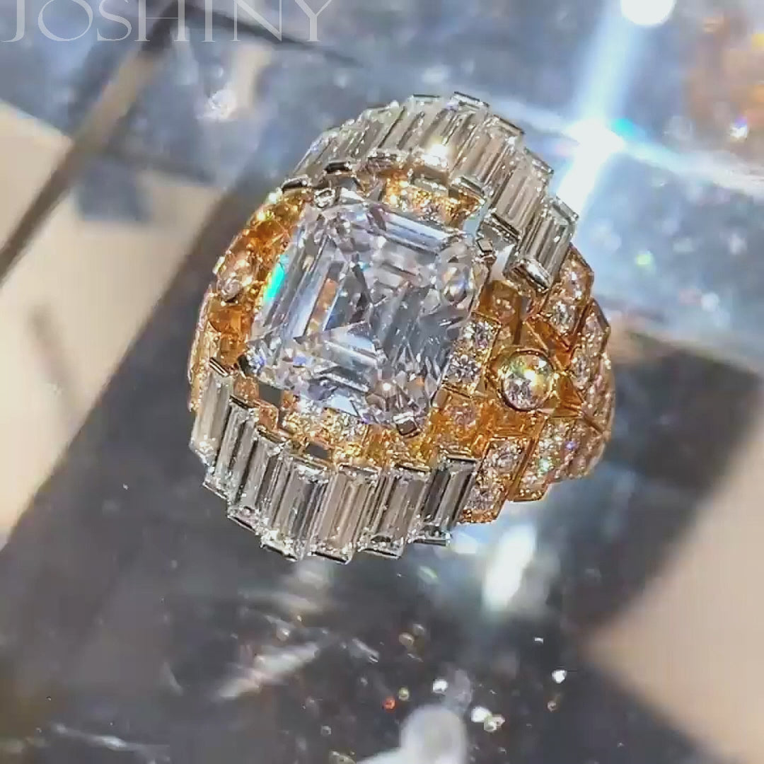 This gorgeous engagement ring is a sight to behold! The design is unique and stylish and can be worn by both men and women. The center features a brilliant ace cut white main stone surrounded by round and baguette cut white stones. The gold and silver color separation is exquisitely detailed and looks sparkling! Total weight is approximately 10 carats.The ring is made of 925 silver throughout, with thick gold plating, which makes the luster last longer compared to other single layer plating. The style is personalized and gorgeous, bringing more possibilities for your fashion collocation.