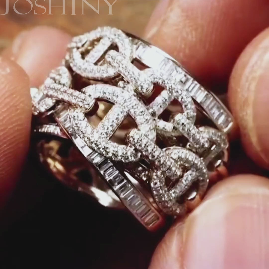 This is a sparkling and stylish ring. The chain design is cool and can be worn by both men and women. Features brilliant round and baguette cut white gemstone pave. The craftsmanship is exquisitely detailed and sparkling. Perfect for everyday wear. Total weight is approximately 7 carats.The ring is made of 925 silver throughout, with thick gold plating, which makes the luster last longer compared to other single layer plating. The style is personalized and stylish, bringing more possibilities for your fashion collocation.
