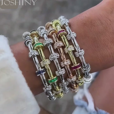 These are striking tubular bangle bracelets. They are set with round-cut diamonds and multi-colored gemstones like green, blue, red, etc. The gemstones and diamonds are arranged in a layered tubular design, looking quite gorgeous. The bracelets are made with gold and silver plating, ensuring a luxurious and long-lasting luster. Their stylish and personalized design makes them stand out, bringing more possibilities for your fashion collocation.
