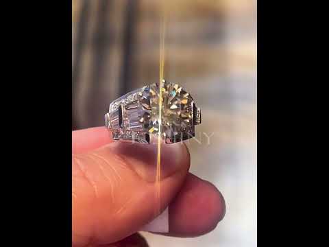 This is a noble engagement ring. The design is classic with a touch of uniqueness. It can be worn by both men and women. The center features a brilliant round cut white main stone. The ring arm has a combination of trapezoidal and square cut white stones set into it. Suitable for many occasions to match. Total weight is approximately 10 carats. The ring is made of 925 silver throughout, with thick gold plating, which makes the luster last longer compared to other single layer plating. The style is personalized and noble, bringing more possibilities for your fashion collocation.