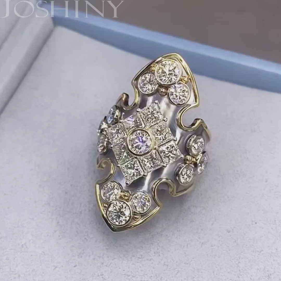 This is an eye-catching, unique and stylish ring that can be worn by both men and women! It is inlaid with a combination of bright square and round cut white gemstones. The two electroplating colors are exquisite and delicate. It is comfortable to wear and suitable for a variety of occasions. The total weight is about 3 carats. The ring is made of 925 silver throughout, with thick gold plating, which makes the luster last longer compared to other single layer plating. The style is personalized and stylish, bringing more possibilities for your fashion collocation.