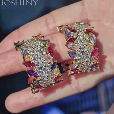 These stunning multi-gem hoop earrings are perfect for various glamorous occasions. The design is opulent yet meticulously crafted, featuring a dazzling array of gemstones. They are set with round-cut white cubic zirconia and marquise-cut rainbow gemstones in colors like red, blue, pink, yellow, and purple. The earrings are crafted with gold-plated metal, ensuring a luxurious and long-lasting shine. Their lavish and vibrant style adds a touch of grandeur to your fashion ensemble, making them a versatile choice for parties, banquets, and other special events.