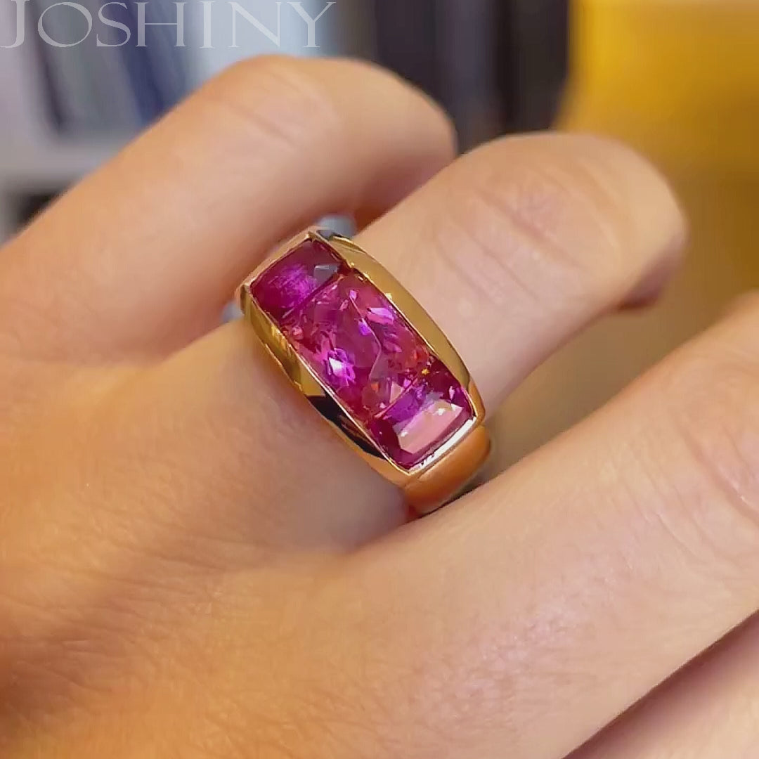 This is a ring with a unique and stylish design that is perfect for everyday wear and matching! Set with a combination of three stunning cushion cut pink gemstones, the rose gold band arm is exquisitely crafted and comfortable to wear. Total weight is approximately 2.5 carats.The ring is made of 925 silver throughout, with thick gold plating, which makes the luster last longer compared to other single layer plating. The style is personalized and simple, bringing more possibilities for your fashion collocation.