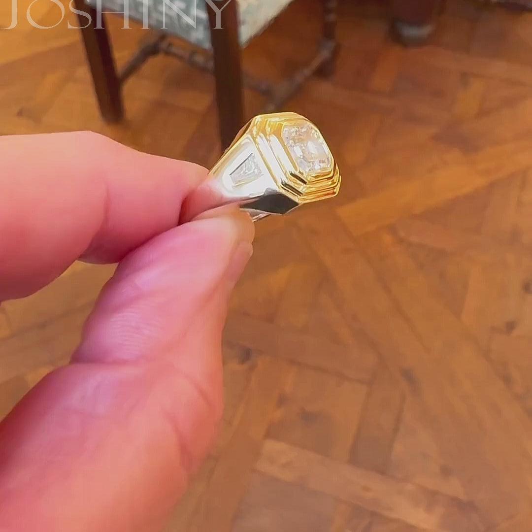 This is a stylish three-stone engagement ring with a simple design that can be worn by both men and women. The center features a brilliant As-cut white main stone. The sides are set with two trapezoid cut white stones. The gold colored band arm is sleek and vintage. Perfect for everyday wear. Total weight is approximately 2 carats.The ring is made of 925 silver throughout, with thick gold plating, which makes the luster last longer compared to other single layer plating. The style is stylish and simple, bringing more possibilities for your fashion collocation.