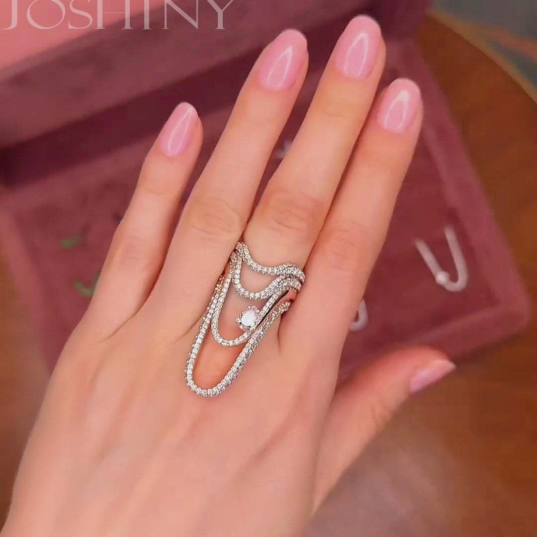This is a ring with a stylish and unique design. Set with a combination of brilliant pear and round cut white stones. The craftsmanship is exquisite and delicate, making it suitable for a variety of occasions. Total weight is approximately 2 carats.The ring is made of 925 silver throughout, with thick gold plating, which makes the luster last longer compared to other single layer plating. The style is personalized and stylish, bringing more possibilities for your fashion collocation.