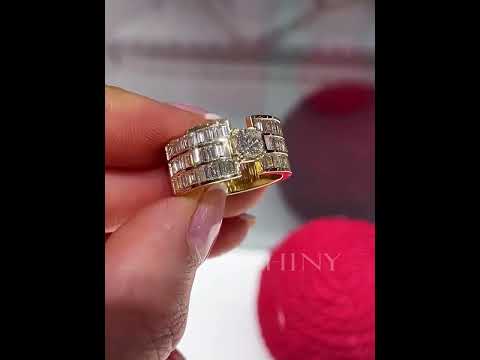 This is a ring with a sleek and sophisticated design. It can be worn by both men and women and is perfect for everyday wear. The center features a brilliant square cut white gemstone. The ring arms are pave set with baguette cut white stones. Total weight is approximately 3 carats. The ring is made of 925 silver throughout, with thick gold plating, which makes the luster last longer compared to other single layer plating. The style is personalized and stylish, bringing more possibilities for your fashion collocation.