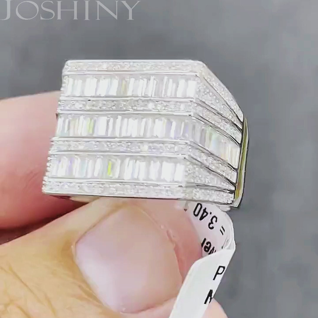 This is a stylishly designed ring that can be worn by both men and women. It is pave set with brilliant baguette and round cut white stones. The entire ring is exquisitely crafted and sparkling! It is comfortable to wear and perfect for everyday matching wear. Total weight is approximately 4 carats.The ring is made of 925 silver throughout, with thick gold plating, which makes the luster last longer compared to other single layer plating. The style is stylish and gorgeous, bringing more possibilities for your fashion collocation.
