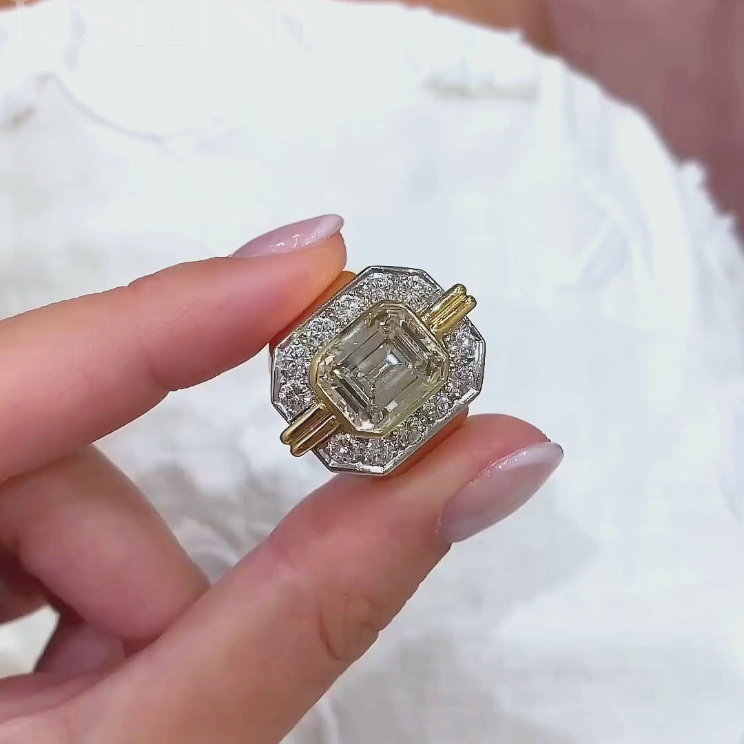 This is a ring with a sleek and simple design that can be worn by both men and women. The center features a brilliant emerald cut white main stone. It is surrounded by a halo of sparkling round cut white stones. The two-tone ring arms are exquisitely crafted and comfortable to wear, making it perfect for everyday wear. Total weight is approximately 4 carats.The ring is made of 925 silver throughout, with thick gold plating, which makes the luster last longer compared to other single layer plating. The style is stylish and simple, bringing more possibilities for your fashion collocation.