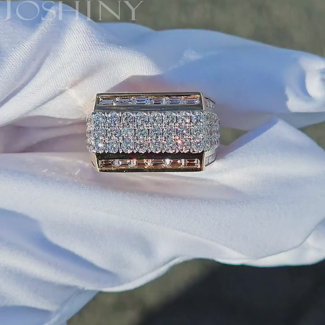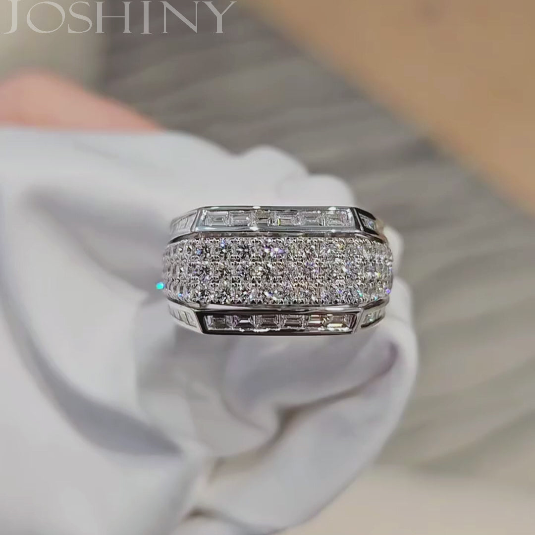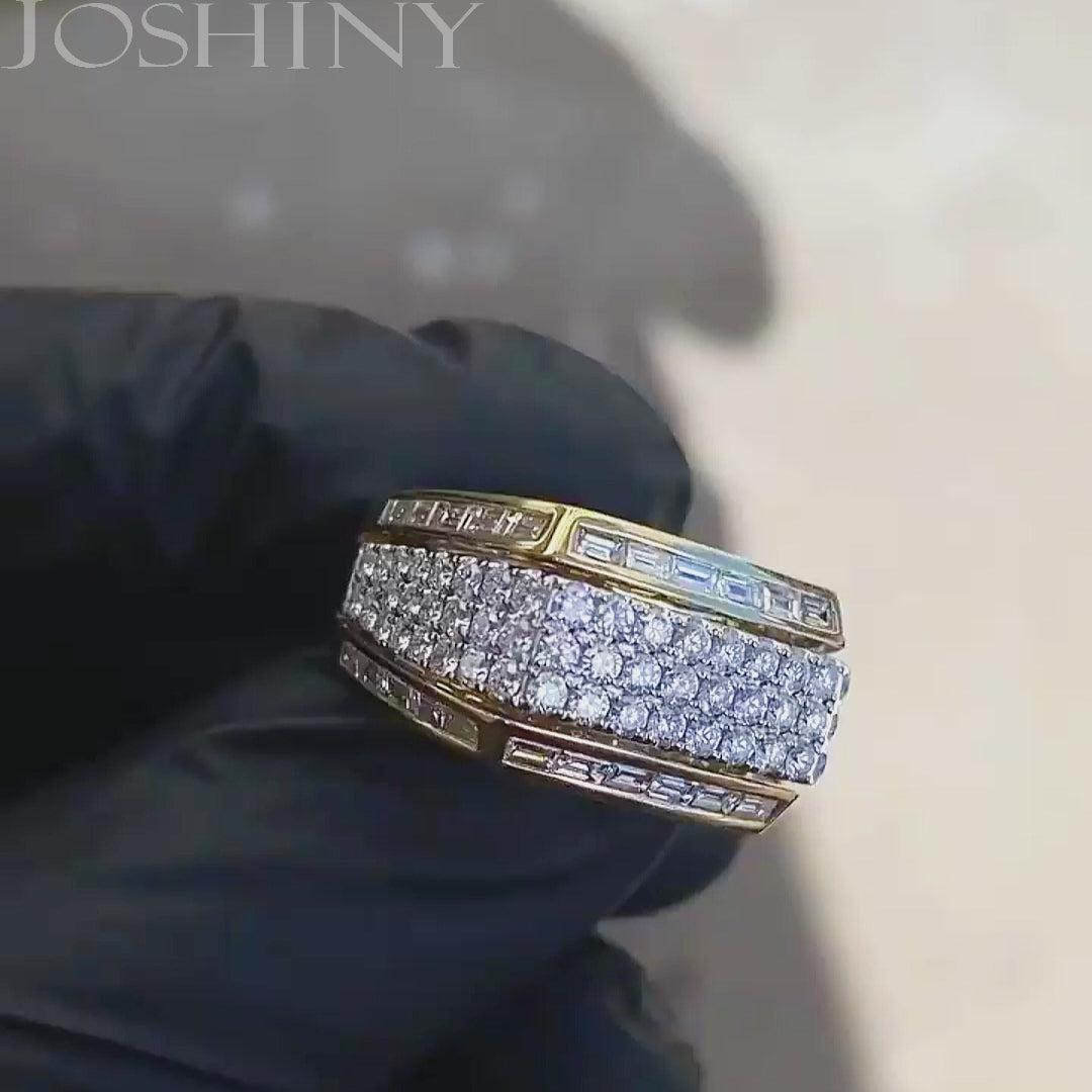 This is a stylish and gorgeous design ring that can be worn by both men and women. It is pave set with sparkling round and baguette cut white gemstones. The craftsmanship is exquisitely detailed, comfortable to wear and sparkling! We offer both gold and silver plating colors for you to choose from. Total weight is approximately 4 carats.The ring is made of 925 silver throughout, with thick gold plating, which makes the luster last longer compared to other single layer plating. The style is gorgeous and stylish, bringing more possibilities for your fashion collocation.