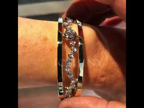 This stylish and personalized bracelet is suitable for many occasions. Bright round cut white stones are set like a river of stars. The design is simple and stylish, the craftsmanship is delicate and sparkling, and it is comfortable to wear. Total weight is approximately 4 carats. The bracelet is made of 925 silver throughout, with thick gold plating, which makes the luster last longer compared to other single layer plating. The style is personalized and simple, bringing more possibilities for your fashion collocation.