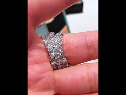 This is a delicate and stylish full set decorative ring. The crease design is unique and interesting. The craftsmanship is exquisite and delicate and sparkling! Set with bright round cut white stones of various sizes. Total weight is approximately 5 carats. The ring is made of 925 silver throughout, with thick gold plating, which makes the luster last longer compared to other single layer plating. The style is personalized and stylish, bringing more possibilities for your fashion collocation.