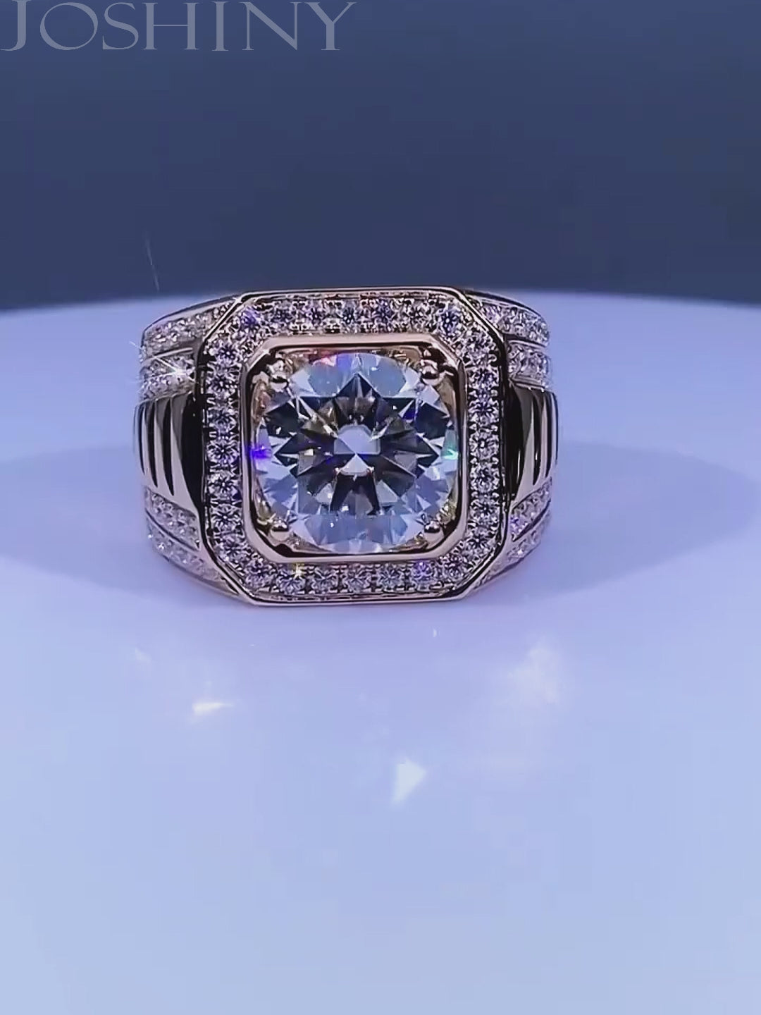 This stylish men's ring is suitable for many occasions. The center features a brilliant round cut white main stone. It is surrounded by pave set round cut white stones. The classic design with high quality craftsmanship gives this ring a delicate and noble look. Total weight is approximately 5 carats. The ring is made of 925 silver throughout, with thick gold plating, which makes the luster last longer compared to other single layer plating. The style is classic and gorgeous, bringing more possibilities for your fashion collocation.