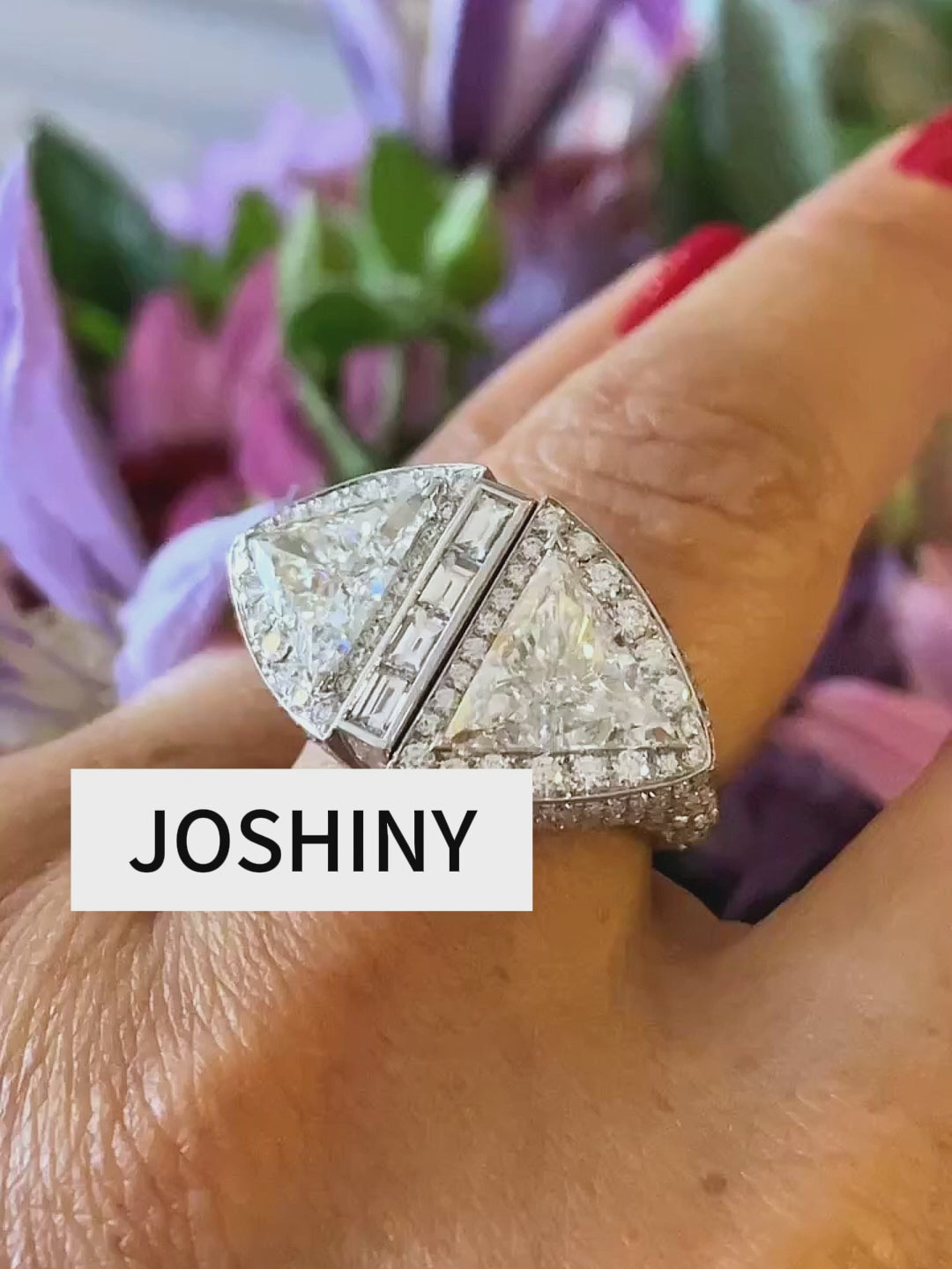 This is a unique two-stone model cocktail ring. The center features two brilliant triangle cut white main stones surrounded by accent settings of baguette and round cut white stones. The entire ring has a unique and stylish design with delicate and sparkling craftsmanship, making it suitable for a variety of occasions. Total weight is approximately 9 carats.The ring is made of 925 silver throughout, with thick gold plating, which makes the luster last longer compared to other single layer plating. The style is personalized and stylish, bringing more possibilities for your fashion collocation.