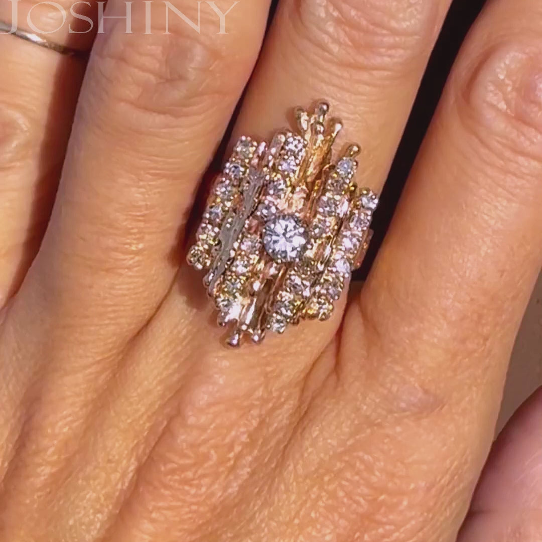 Make a statement with this uniquely designed ring! Set with a combination of sparkling round cut white gemstones of varying sizes. The special textured shape of the ring arm is exquisitely crafted. The entire ring is comfortable to wear and perfect for everyday wear. Total weight is approximately 1.5 carats.The ring is made of 925 silver throughout, with thick gold plating, which makes the luster last longer compared to other single layer plating. The style is personalized and exquisite, bringing more possibilities for your fashion collocation.