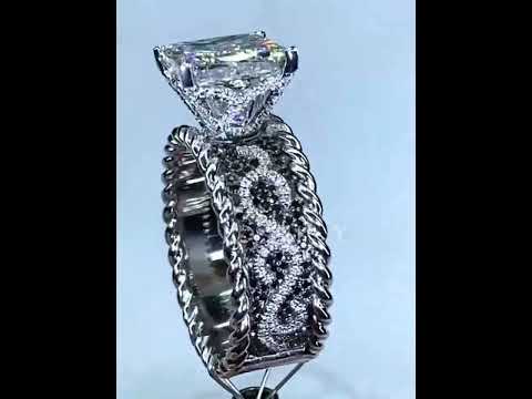 Make a statement with this unique engagement ring! The center features a sparkling square cut white main stone. The widened ring arms look very distinctive with a combination of round cut white and black stones set in a beautiful floral pattern! The craftsmanship is exquisitely sparkling and suitable for many occasions. Total weight is approximately 10 carats.The ring is made of 925 silver throughout, with thick gold plating, which makes the luster last longer compared to other single layer plating. The style is personalized and gorgeous, bringing more possibilities for your fashion collocation.