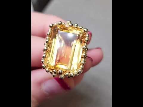 This unique cocktail ring is quite stunning! The center features a huge bright emerald cut yellow stone. The unique bead surround is the highlight of this ring. Total weight is approximately 12 carats. The ring is made of 925 silver throughout, with thick gold plating, which makes the luster last longer compared to other single layer plating. The style is personalized and simple, bringing more possibilities for your fashion collocation.