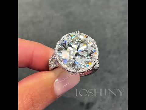 This one-of-a-kind handcrafted mounting was designed and constructed to hold a spectacular 11CT round brilliant gemstone centre stone. Our team worked to create a ring that offers beauty from every angle and ensured that every detail of the ring complements and emphasises the awe-inspiring beauty of this unique stone.
