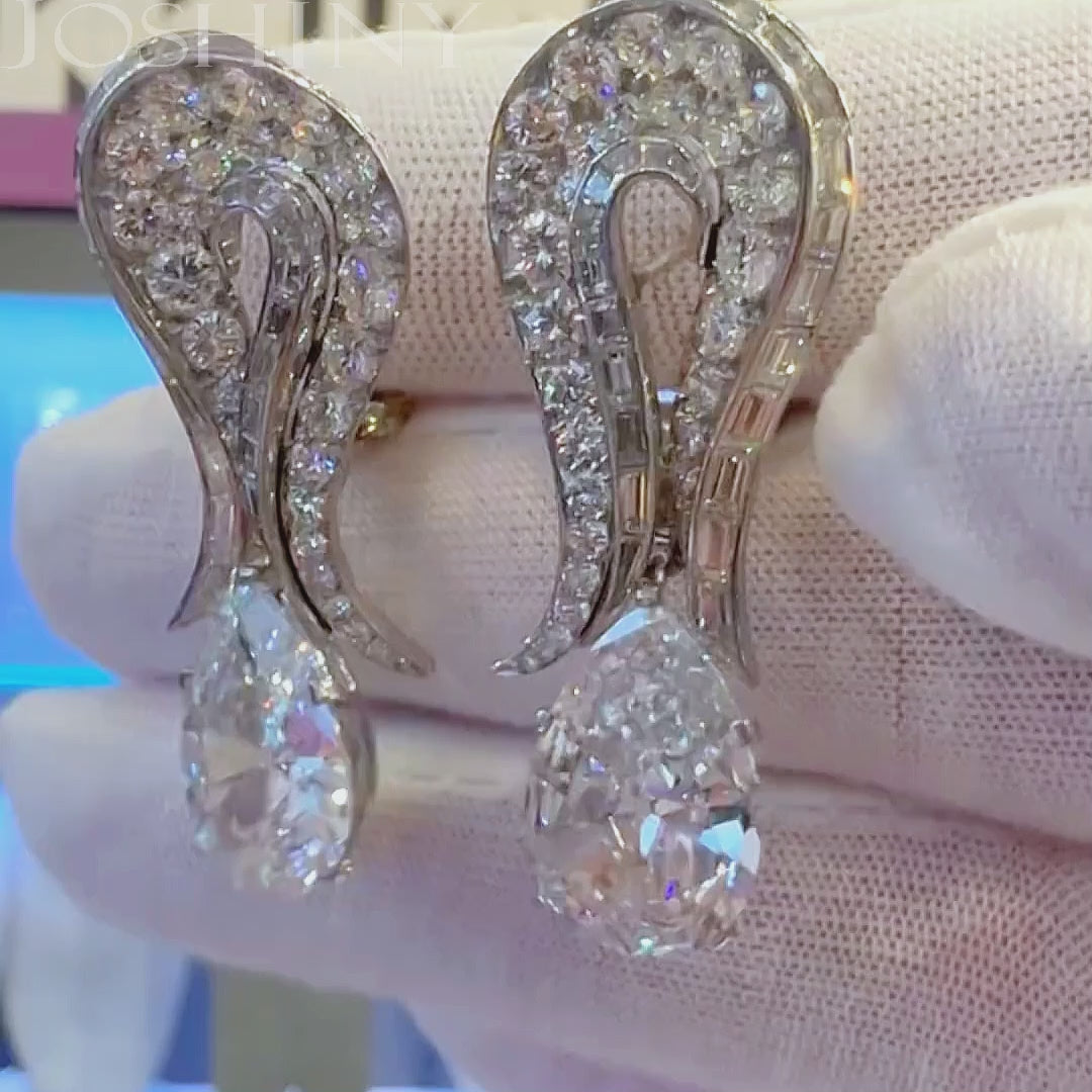 This is a very striking earring with a unique and gorgeous design! Featuring two huge sparkling pear cut white main stones on the bottom and bright round and baguette cut white stones pave set on the top. The craftsmanship is exquisite and delicate, and the sparkle is magnificent! Ideal for many occasions. Total weight is approximately 20 carats.The earrings is made of 925 silver throughout, with thick gold plating, which makes the luster last longer compared to other single layer plating. The style is personalized and gorgeous, bringing more possibilities for your fashion collocation.