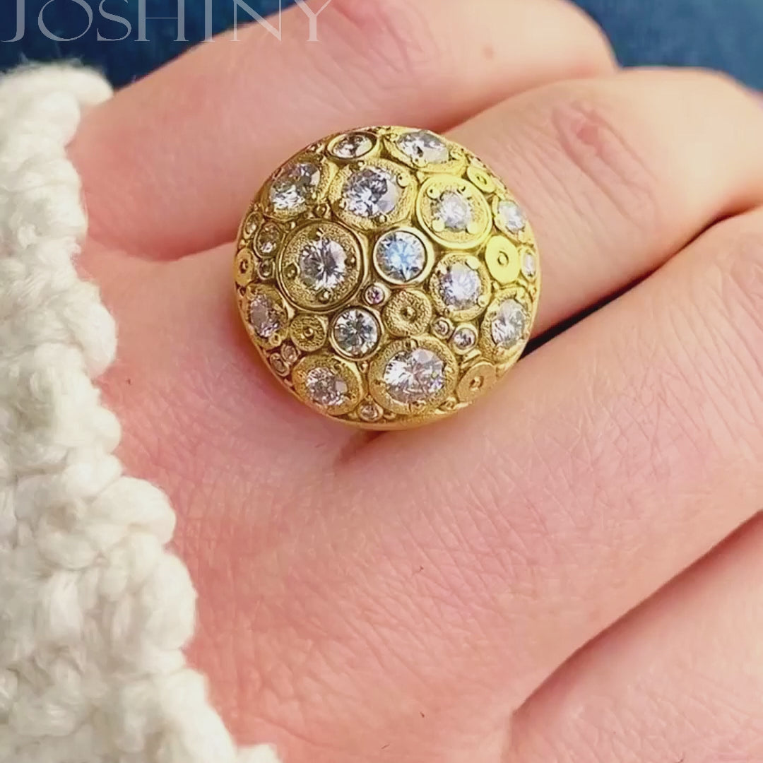 This is a ring that makes a statement! The design is unique and stylish, disc shaped interface embellished with bright round cut white stones of varying sizes, exquisitely crafted and sparkling. Suitable to wear with many occasions. Total weight is approximately 3 carats.The ring is made of 925 silver throughout, with thick gold plating, which makes the luster last longer compared to other single layer plating. The style is personalized and stylish, bringing more possibilities for your fashion collocation.