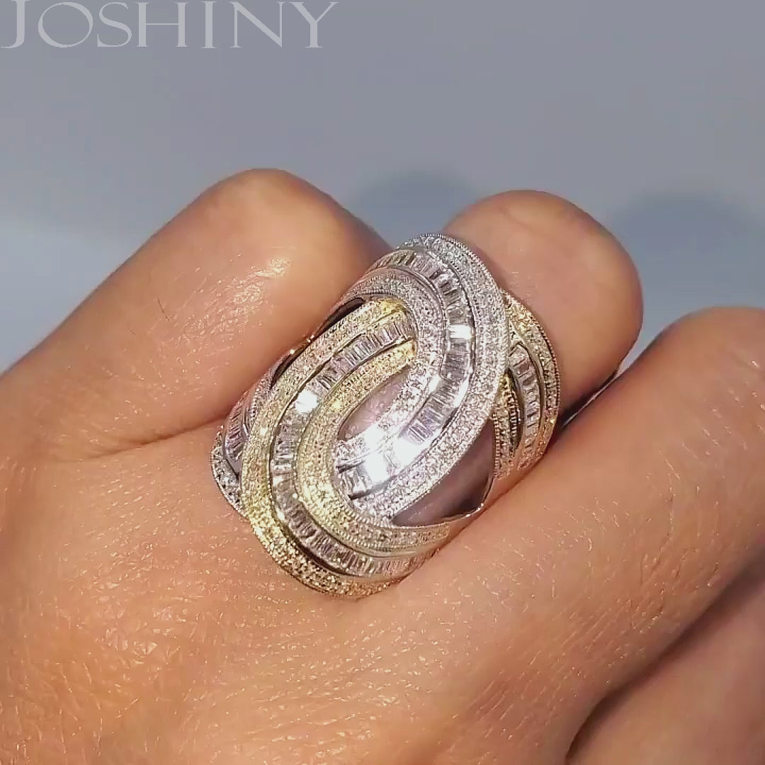 This is a striking ring! The design is unique and stylish, featuring brilliant trapezoidal and round cut white gemstone pavé. The craftsmanship is exquisitely detailed and gorgeously sparkling! Perfect to wear with many occasions. Total weight is approximately 4.5 carats.The ring is made of 925 silver throughout, with thick gold plating, which makes the luster last longer compared to other single layer plating. The style is personalized and stylish, bringing more possibilities for your fashion collocation.