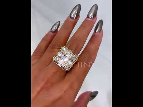 This unique ring can be worn by both men and women. It is suitable for many occasions to match. Set with a combination of baguette and round cut white stones. Total weight is approximately 4 carats. The ring is made of 925 silver throughout, with thick gold plating, which makes the luster last longer compared to other single layer plating. The style is personalized and gorgeous, bringing more possibilities for your fashion collocation.