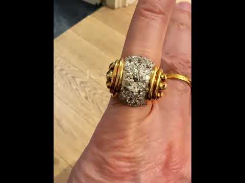 This is a ring that can be worn by both men and women with a unique vintage design and exquisite craftsmanship. The center features a brilliant round cut white main stone surrounded by pave set round cut white stones. The ring arm is simple and unique in shape, comfortable to wear and suitable for many occasions. Total weight is approximately 4 carats. The ring is made of 925 silver throughout, with thick gold plating, which makes the luster last longer compared to other single layer plating. The style is personalized and vintage, bringing more possibilities for your fashion collocation.