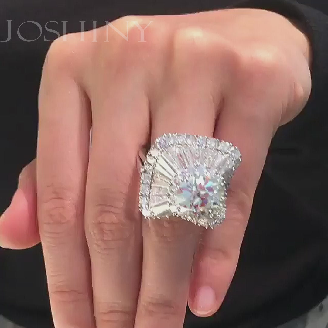 This is an absolutely striking engagement ring. Trapezoidal and round cut white stones cluster like ocean waves around a brilliant round cut white main stone. The design is unique and elegant. Total weight is approximately 6 carats. The ring is made of 925 silver throughout, with thick gold plating, which makes the luster last longer compared to other single layer plating. The style is personalized, bringing more possibilities for your fashion collocation.