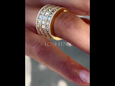 This is a unique full ring band. It can be worn by both men and women. Set with a combination of brilliant square and round cut white stones. It looks very gorgeous and sparkling and can be worn with many occasions. Total weight is approximately 6 carats.The ring is made of 925 silver throughout, with thick gold plating, which makes the luster last longer compared to other single layer plating. The style is personalized and gorgeous, bringing more possibilities for your fashion collocation.