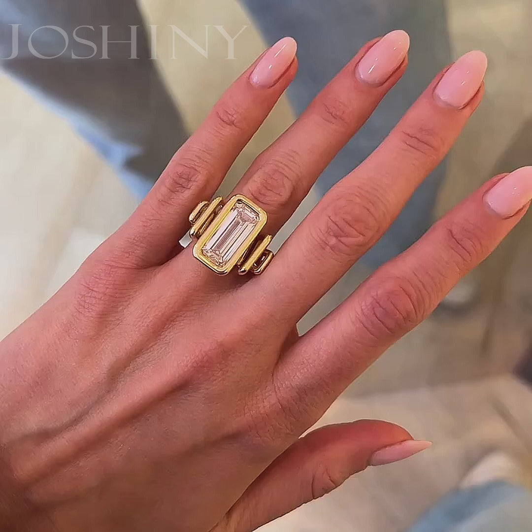 This unique ring is sleek and eye-catching. Bright emerald cut white stones are paired with gold geometric band arms. It looks exquisite and tasteful. Total weight is approximately 7 carats. The ring is made of 925 silver throughout, with thick gold plating, which makes the luster last longer compared to other single layer plating. The style is personalized and simple, bringing more possibilities for your fashion collocation.