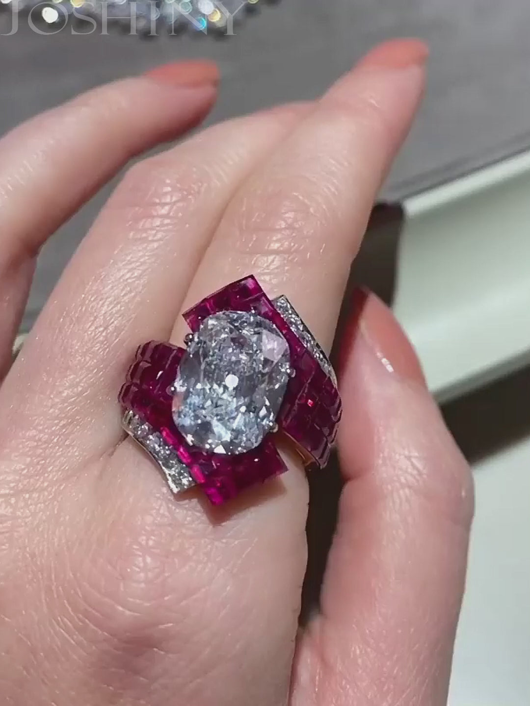 Unique 8 ctw Cushion Cut White Gemstone & Square Cut Ruby Ring -JOSHINY