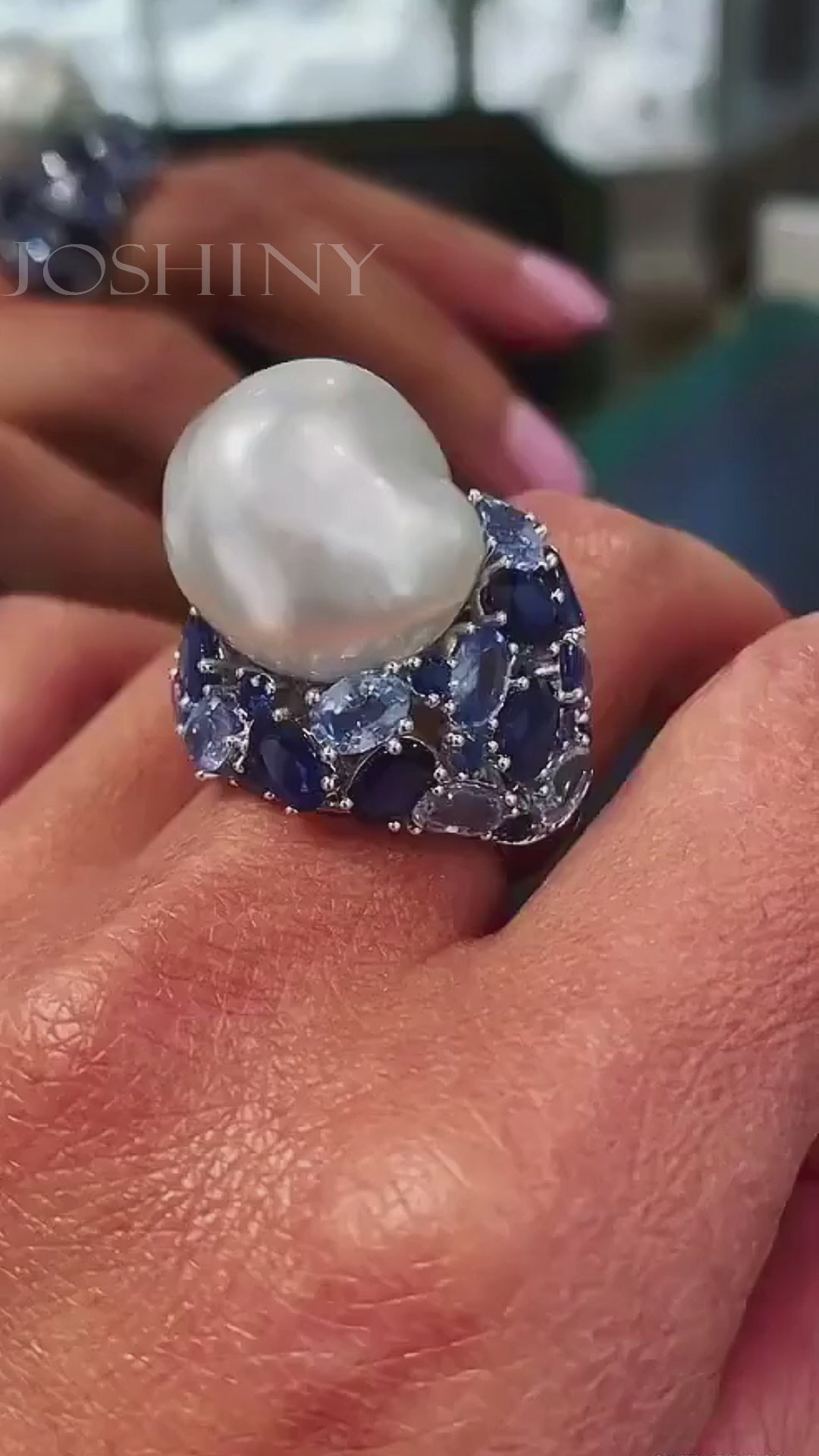 Unique Irregular Pearl Blue Gemstone Diamond Ring