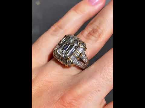 This is an engagement ring that can be worn by both men and women. The design is classic and vintage. The craftsmanship is exquisite and delicate. Perfect for daily matching. The center features a brilliant emerald cut white main stone surrounded by a halo of trapezoid cut white stones. The arms are set with trapezoidal cut white stones. Total weight is approximately 10 carats. The ring is made of 925 silver throughout, with thick gold plating, which makes the luster last longer compared to other single layer plating. The style is classic and vintage, bringing more possibilities for your fashion collocation.