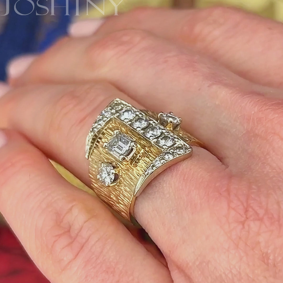 Vintage 2 ctw Round & Emerald Cut White Gemstone Two Tone Textured Buckle Ring -JOSHINY