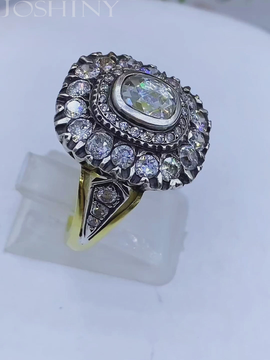This is a vintage engagement ring. The center features a cushion cut white main stone surrounded by an aperture of round cut white stones. The gold-colored ring arms are uniquely elegant. It is suitable for many occasions. Total weight is approximately 3 carats.The ring is made of 925 silver throughout, with thick gold plating, which makes the luster last longer compared to other single layer plating. The style is personalized and vintage, bringing more possibilities for your fashion collocation.