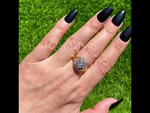 This vintage design engagement ring looks sophisticated and elegant. The center features a brilliant round cut white main stone. It is surrounded by a halo of round cut white stones. The total weight is approximately 3 carats. The ring is made of 925 silver throughout, with thick gold plating, which makes the luster last longer compared to other single layer plating. The style is personalized and vintage, bringing more possibilities for your fashion collocation.